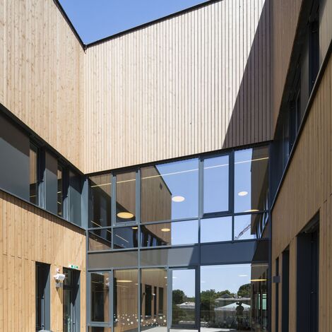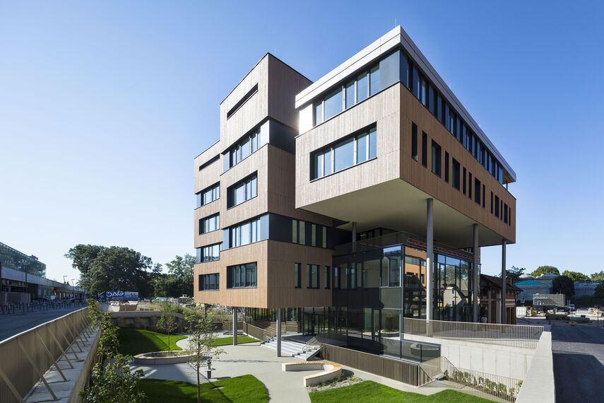 As with the facade design of the neighbouring building, contrasts and geometric shapes play a key role in the school building. For example, slightly projecting transoms set in wood alternate with the dark intermediate floors, which makes it look like the number of floors is halved. While the “Korso” is framed in ceramic elements in similar colours for fire protection reasons, the elongated floors of the school building are clad in pre-patinated larch.