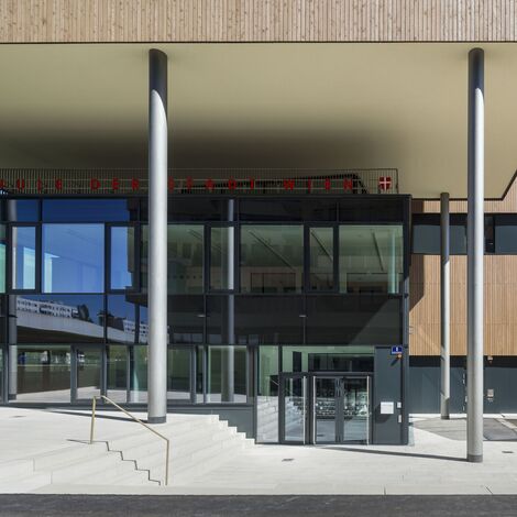 Architect Martin Kohlbauer from Vienna won the architectural competition for designing the “Korso” and school building back in 2016. The buildings have many design principles in common, including their role in an urban setting, their finely structured facades and the appropriate integration of existing listed buildings. For example, the Olly-Schwarz-Schule neighbours the “Zuckerlhaus” in the south-west – the historic main building of the old stables that has been preserved close by. On the same side of the school building is the glazed main entrance, which is set back significantly and features high, filigree columns and an overhanging superstructure.